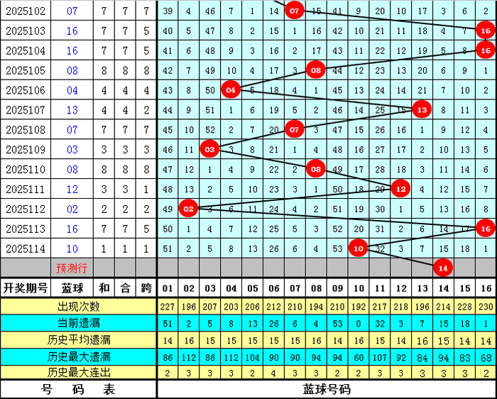 蓝球分析:最近7期蓝球号码012路比为2:3:2,奇偶比为2:5,大小比为3:4,本期注意偶数蓝球开出,一码蓝球参考14。